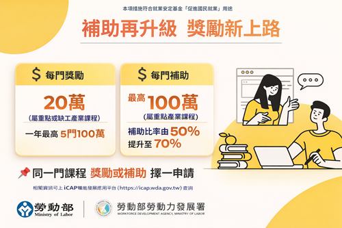 補助、獎勵雙管齊下!勞動部加碼百萬獎勵、調升補助比率 力挺產業人才培訓升級 展示圖 附圖_補助、獎勵雙管齊下!勞動部加碼百萬獎勵、調升補助比率 力挺產業人才培訓升級