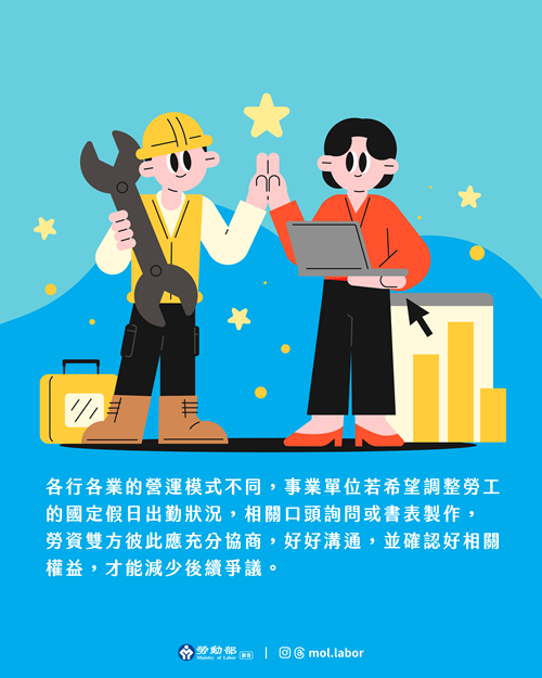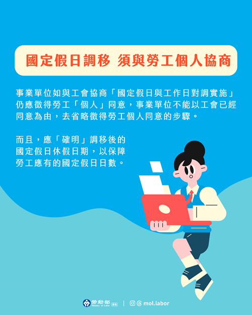 勞動部表示,勞資雙方亦得就「國定假日與工作日對調實施」進行協商,惟該協商因涉個別勞工勞動條件之變更,仍應徵得勞工「個人」之同意。至於勞資雙方雖得協商約定將國定假日調移至其他「工作日」實施,仍應確明前開所調移國定假日之休假日期,即國定假日與工作日對調後,因調移後之國定假日當日,成為正常工作日,該等被調移實施休假之原工作日即應使勞工得以休假,且雇主不得減損勞工應有之國定休假日數,始屬適法。