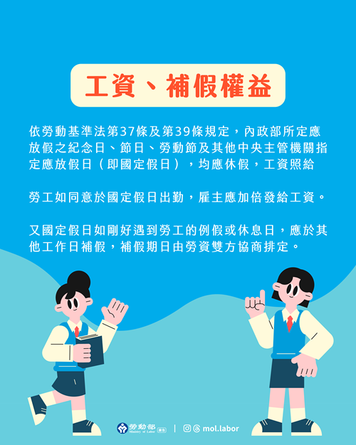 勞動部提醒,由於各事業單位之營運方式及排班態樣多元,例假或休息日不見得均排定於星期六及星期日,國定假日補假日期亦有所不同,個案上仍有差異,雇主應就各該假別之期日,與勞工明確約定,以利釐清勞工出勤工資之給付標準,減少爭議發生。